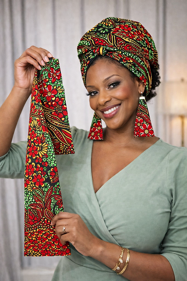 Handmade African print headwrap crafted from soft, breathable cotton for comfortable all-day wear. This long, versatile wrap allows for multiple styling options and is perfect for natural hair, protective styles, church, and everyday elegance. A bold, faith-inspired accessory designed to crown the modern Blesseth4 woman 💚.