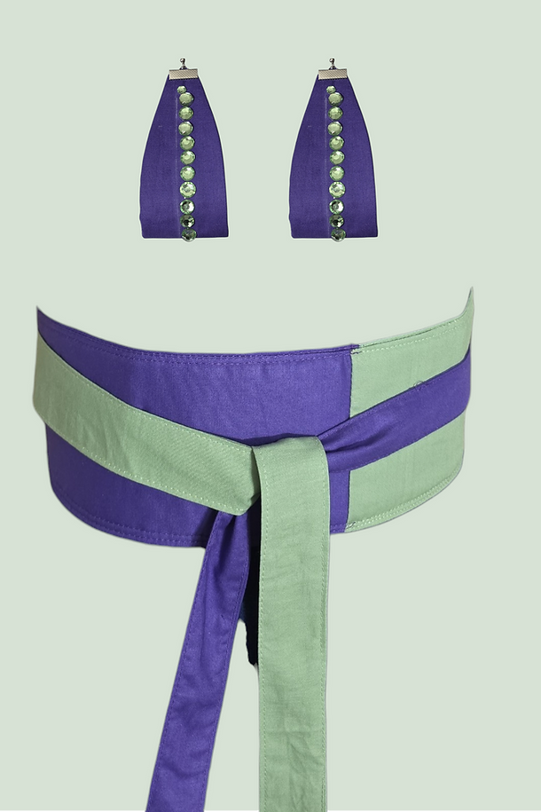 Handmade reversible purple & sage obi belt with matching earrings. Adjustable, elegant, and perfect for dresses, church, and special occasions.Belt Length: 110 x 4 inches
